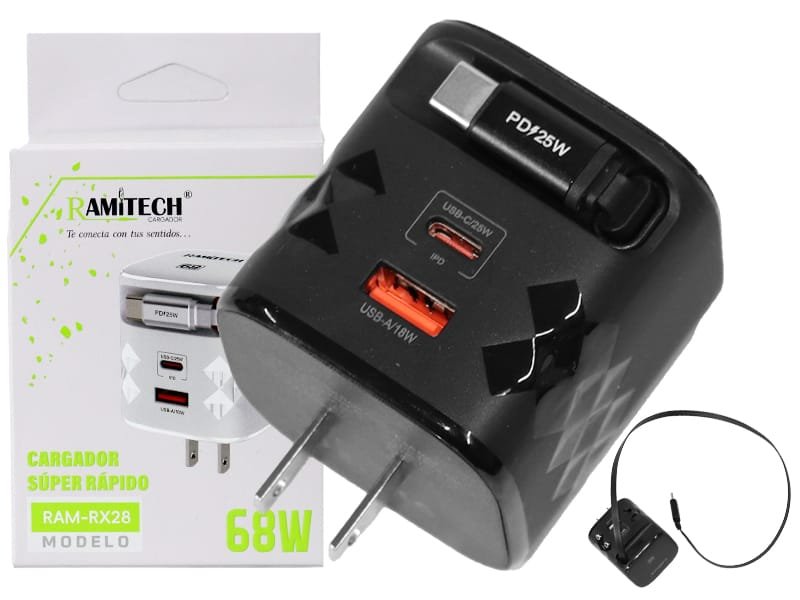 Cargador Rapido Usb De 68W Con Cable Retractil Tipo C Pd x 25W Usb-A 18W Ramitech