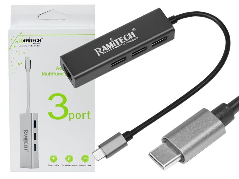Multipuerto Adaptador De Red Tipo C 3.0 A Ethernet + Hub 3 Puertos 3.0 Aluminio Ramitech